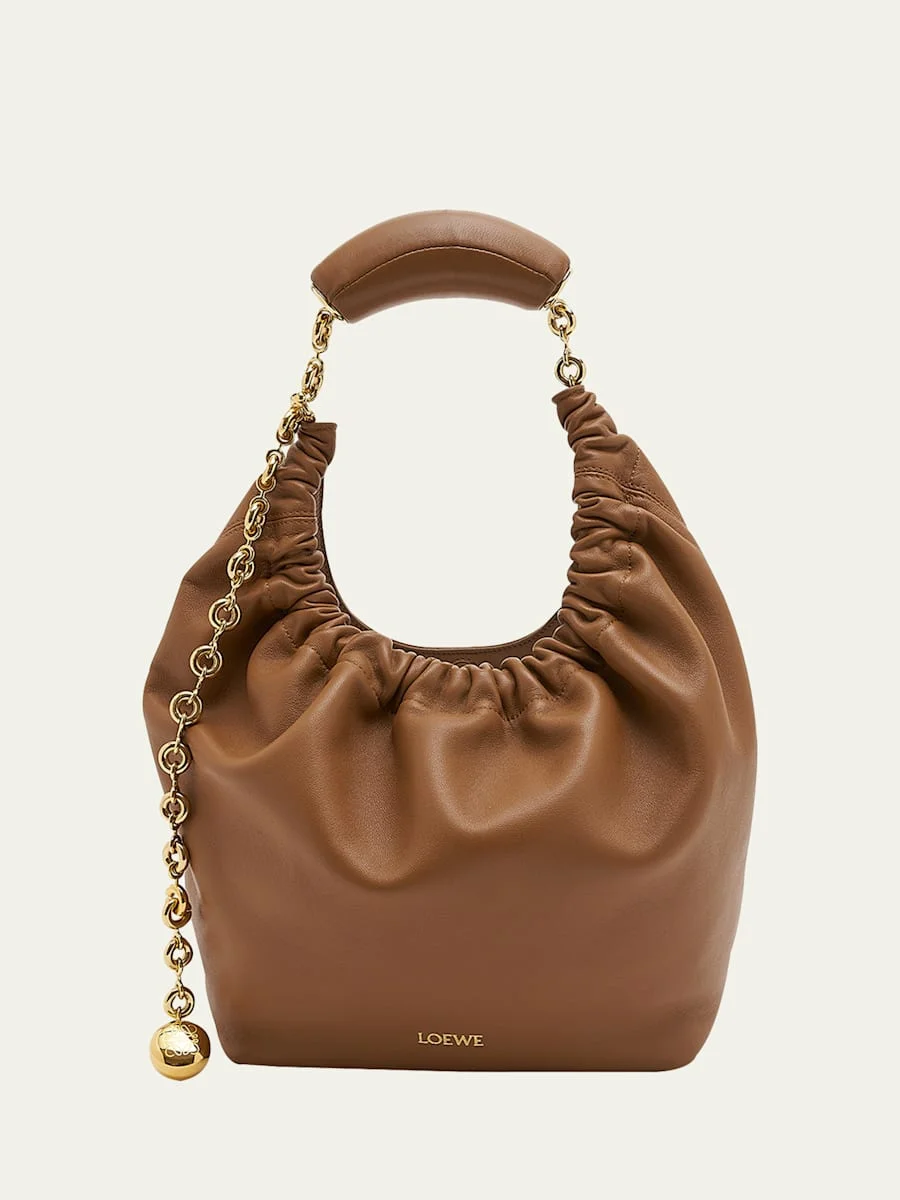 Loewe hobo bag in leather, cotton, and linen Chain top handle Ruched open top with magnetic closure Interior, one zip pocket Approx. 9.4"H x 11.3"W x 4.1"D Made in Spain Online Inquiries: BGS21_V6A15| Store Inquiries: #4619771