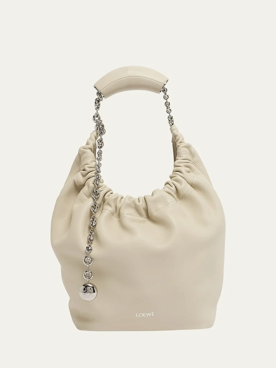 Loewe hobo bag in leather, cotton, and linen Chain top handle Ruched open top with magnetic closure Interior, one zip pocket Approx. 9.4"H x 11.3"W x 4.1"D Made in Spain