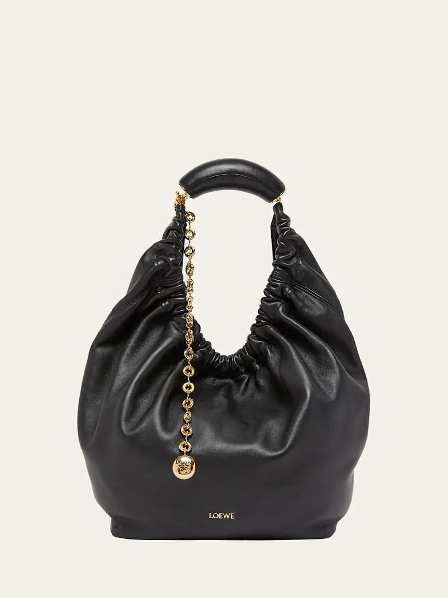 Loewe hobo bag in leather, cotton, and linen Chain top handle Ruched open top with magnetic closure Interior, one zip pocket Approx. 9.4"H x 11.3"W x 4.1"D Made in Spain Online Inquiries: BGS21_V6A15| Store Inquiries: #4619771