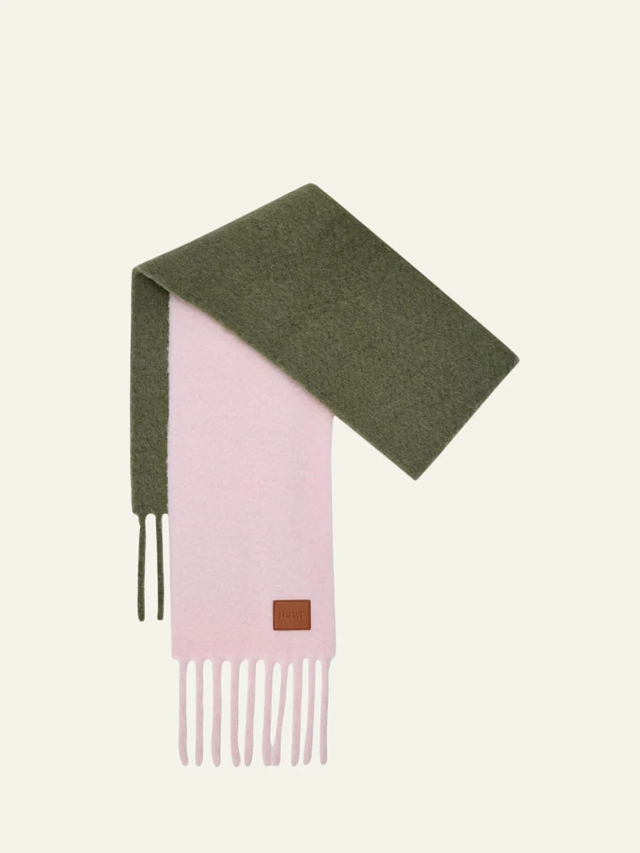 Crafted from a mediumweight blend of alpaca and wool, this Loewe scarf features a twotone design. Approx. 69.3"L x 9.1"W Fringed edges Embossed logo leather patch placed on the corner May be styled multiple ways Alpaca/wool Made in Italy