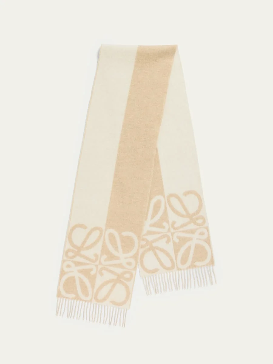 Loewe scarf featuring a twotone Anagram jacquard pattern. Approx. 70"L x 11"W Fringed edges May be styled multiple ways Wool/cashmere Made in United Kingdom