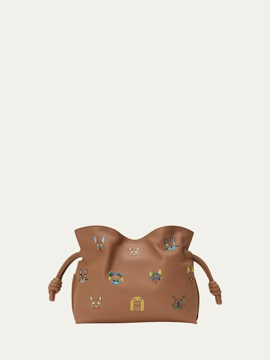 This "Flamenco" clutch bag from Loewe is designed in leather adorned with playful faces inspired by artwork from the English artist Louis Wain Detachable shoulder strap Can be worn as a clutch, top handle, or shoulder bag Drawstring and magnetic closure Approx. 7"H x 9.3"W x 3.5"D Professional cleaning recommended Made in Spain