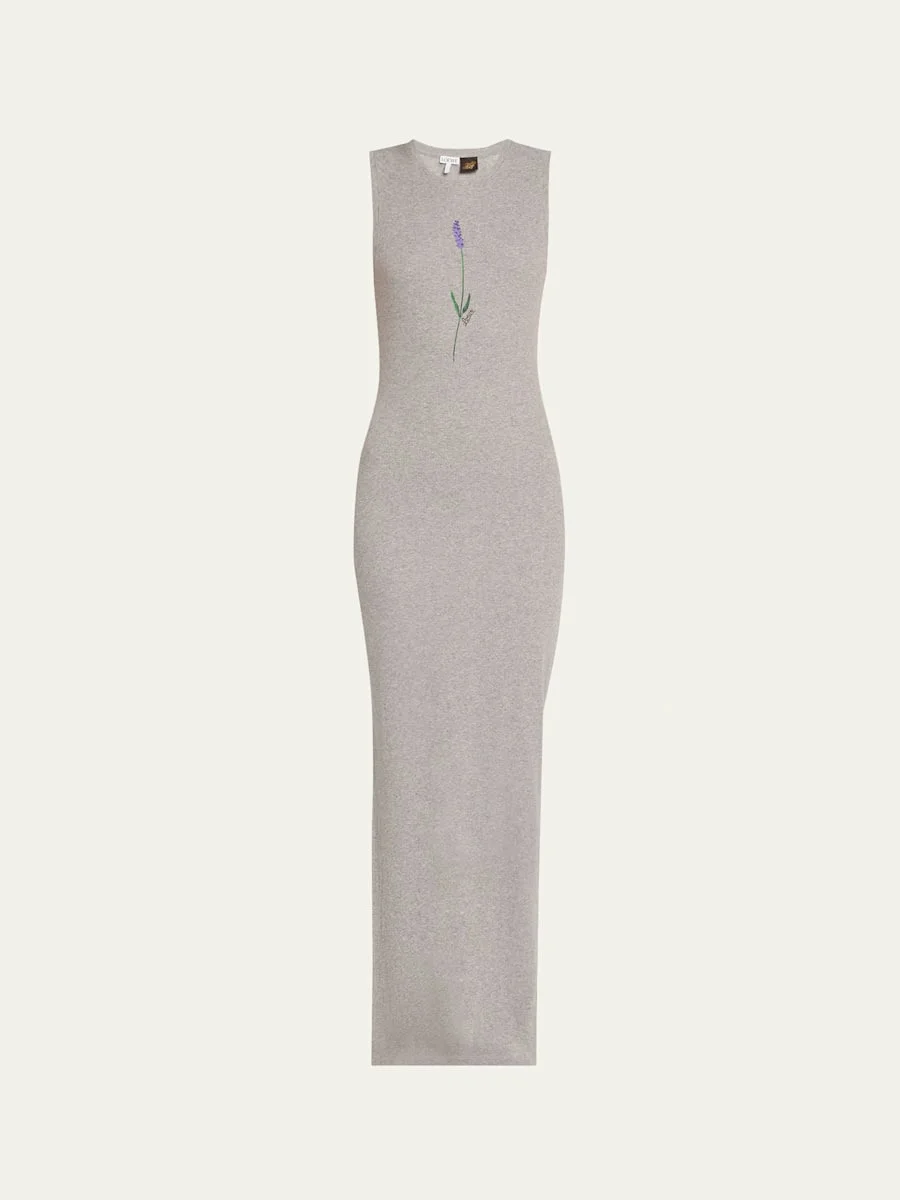 Loewe x Paula’s Ibiza ribbed knit tank dress featuring a single flower printed front and a bouquet printed back with a logo patch Part of the Paula's Ibiza collaboration collection Round neckline Sleeveless Body skimming silhouette Full length Slipover style Cotton/elastane Dry clean Made in Portugal Online Inquiries: BGS21_BA3L0| Store Inquiries: #5025524