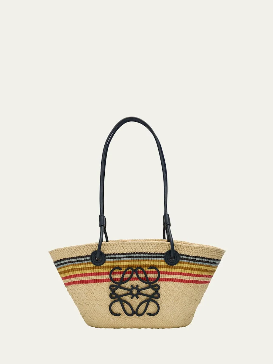 Loewe striped basket raffia tote bag with Anagram accent Shoulder straps Open top with selftie closure Leather trim Approx. 6.6"H x 14.8"W x 5.1"D Made in Spain