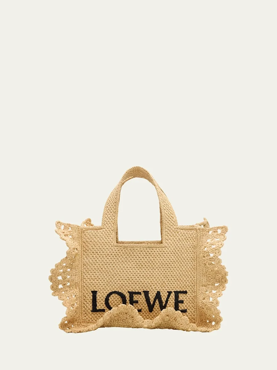 Loewe raffia tote bag with ruffled trim Top handles Removable, adjustable crossbody strap Can be worn as a top handle or crossbody bag Open top Approx. 7.6"H x 9.4"W x 4.3"D Leather/viscose Made in Spain
