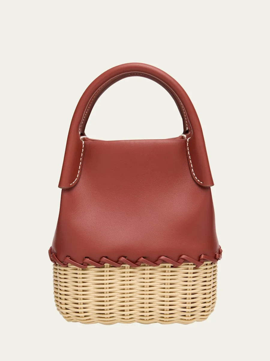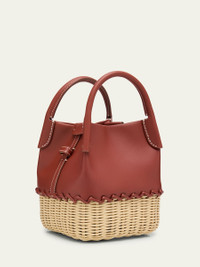 Loro Piana "Bale" leather and rattan bucket bag with a rounded silhouette Rolled top handles Removable, adjustable crossbody strap Can be worn as a top handle or crossbody bag Open top with chain toggle closure Lining: Leather Approx. 4.3"H x 7.5"W x 2.6"D Wipe clean Made in Italy