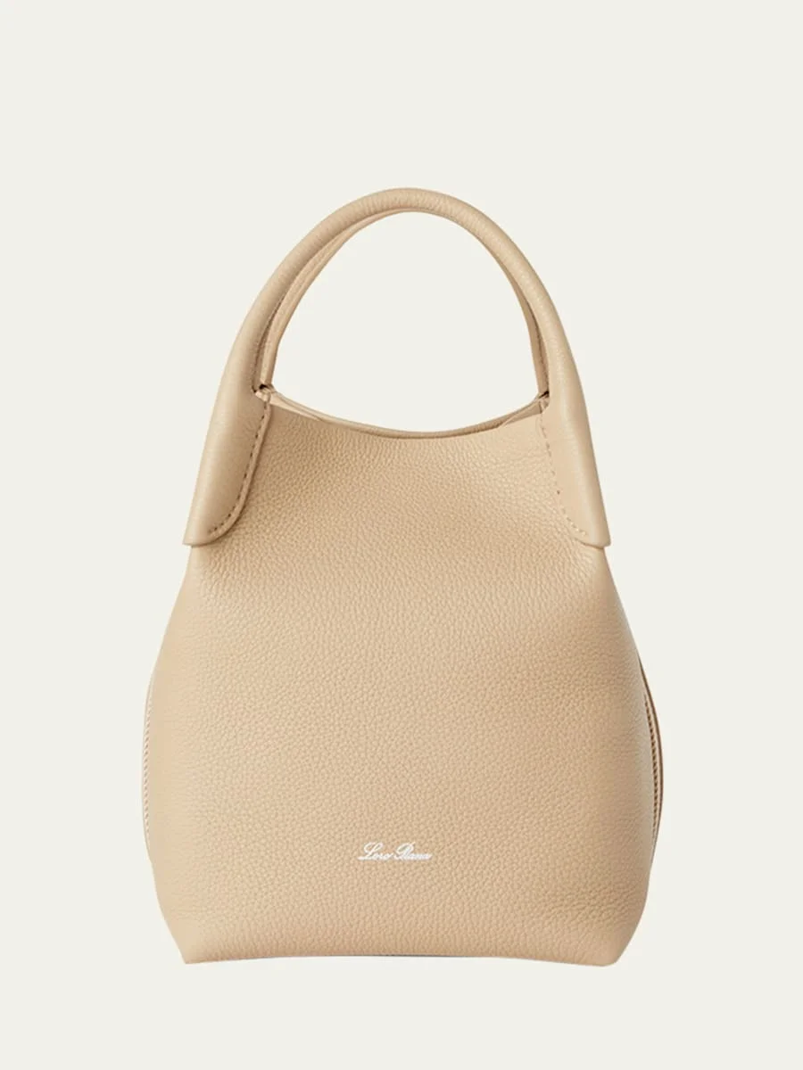 Loro Piana "Bale" top handle bag in grained leather Top handles Detachable, adjustable crossbody strap Can be worn as a top handle or crossbody bag Open top with hook closure Interior, leashed zip pouch bag Approx. 8.2"H x 6.6"W x 6.6"D Made in Italy Proposition 65 warning for California residents Online Inquiries: BGS21_V64ZT| Store Inquiries: #4724615
