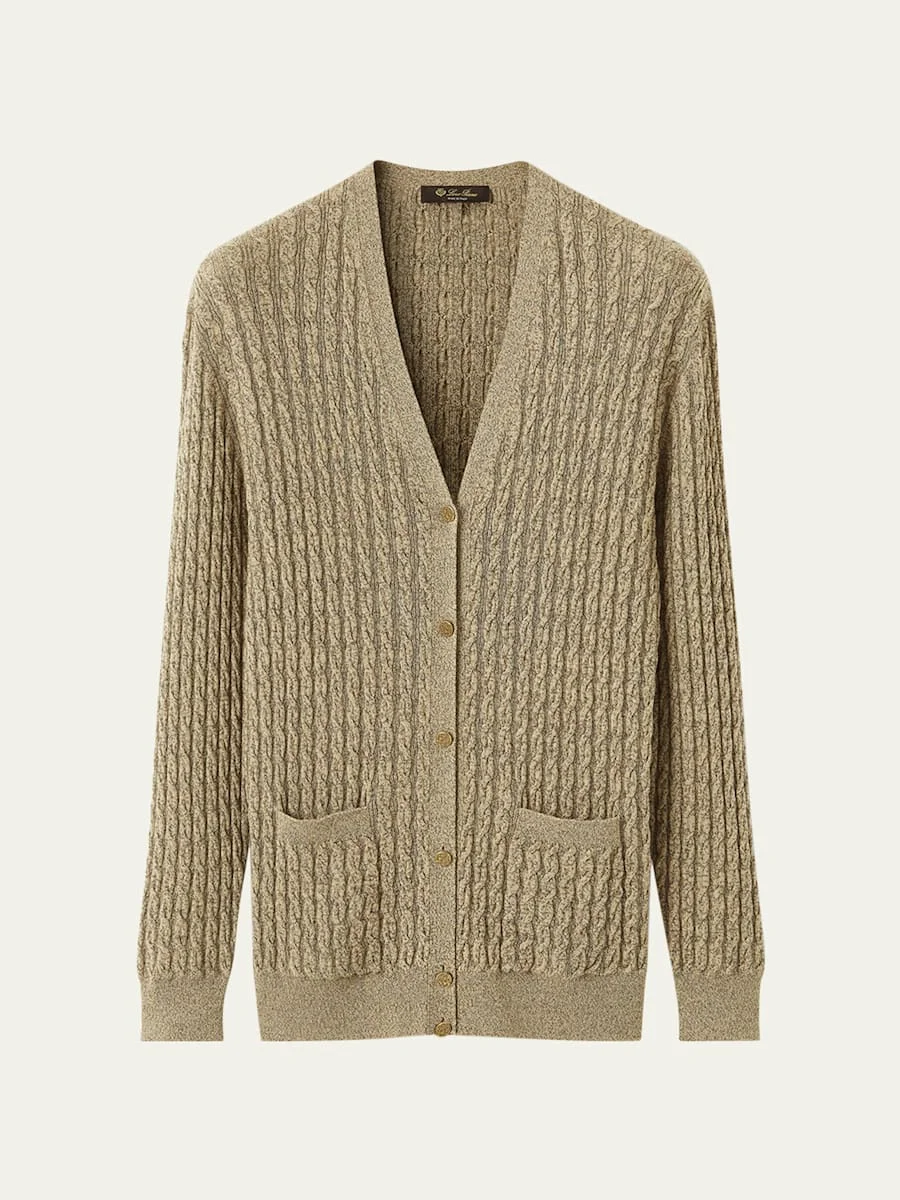 The "Bihar" cardigan by Loro Piana is knit from a cashmere blend with textural cable detailing Vneckline; button front Dropped shoulders Long sleeves Front patch pockets Longline silhouette Slim fit Cashmere/silk/nylon/polyamide Dry clean Made in Italy