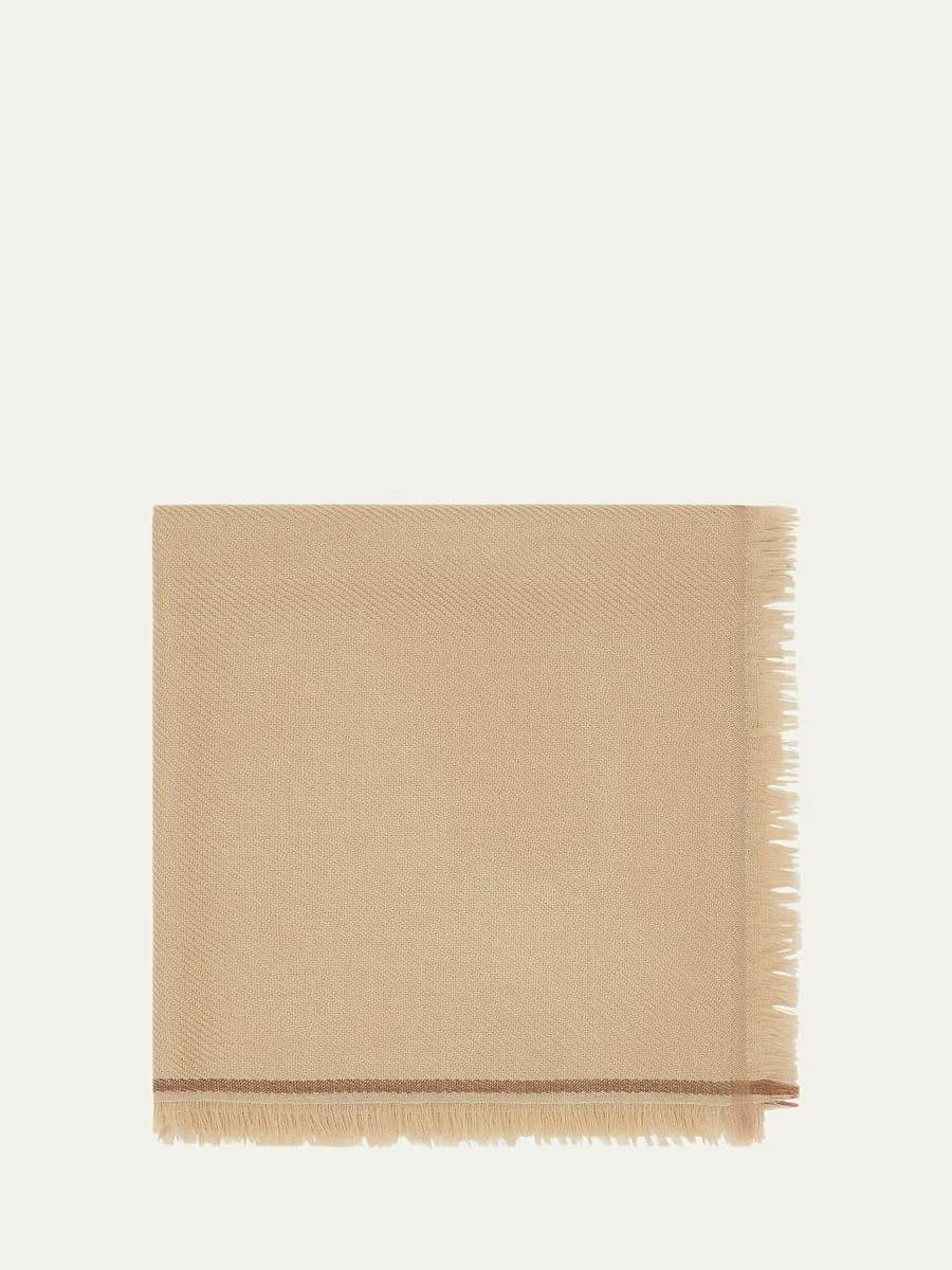 Loro Piana cashmere scarf with striped trim Approx. 47.2"L x 47.2"W Eyelash trim Can be styled multiple ways Cashmere Made in Italy Online Inquiries: BGS21_D5113| Store Inquiries: #4875051