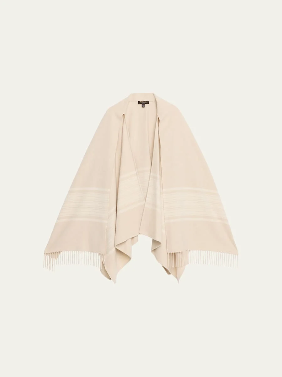 The Loro Piana "Daisy" cape is crafted from soft brushed cashmere, featuring horizontal stripes and a coordinating scarf accent trimmed with delicate fringe. Open front Cape sleeves Fringed edges Hem rests below the hips Cashmere Dry clean Made in Italy