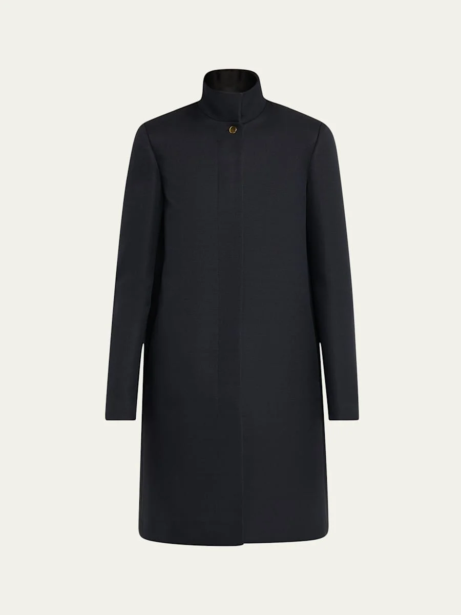 Loro Piana "Danny" streamlined coat crafted from Barathea tightly woven fabric Stand collar; button closure Long sleeves Loose fit Cashmere Dry clean Made in Italy Proposition 65 warning for California residents Online Inquiries: BGS21_B9SJ4| Store Inquiries: #4956638