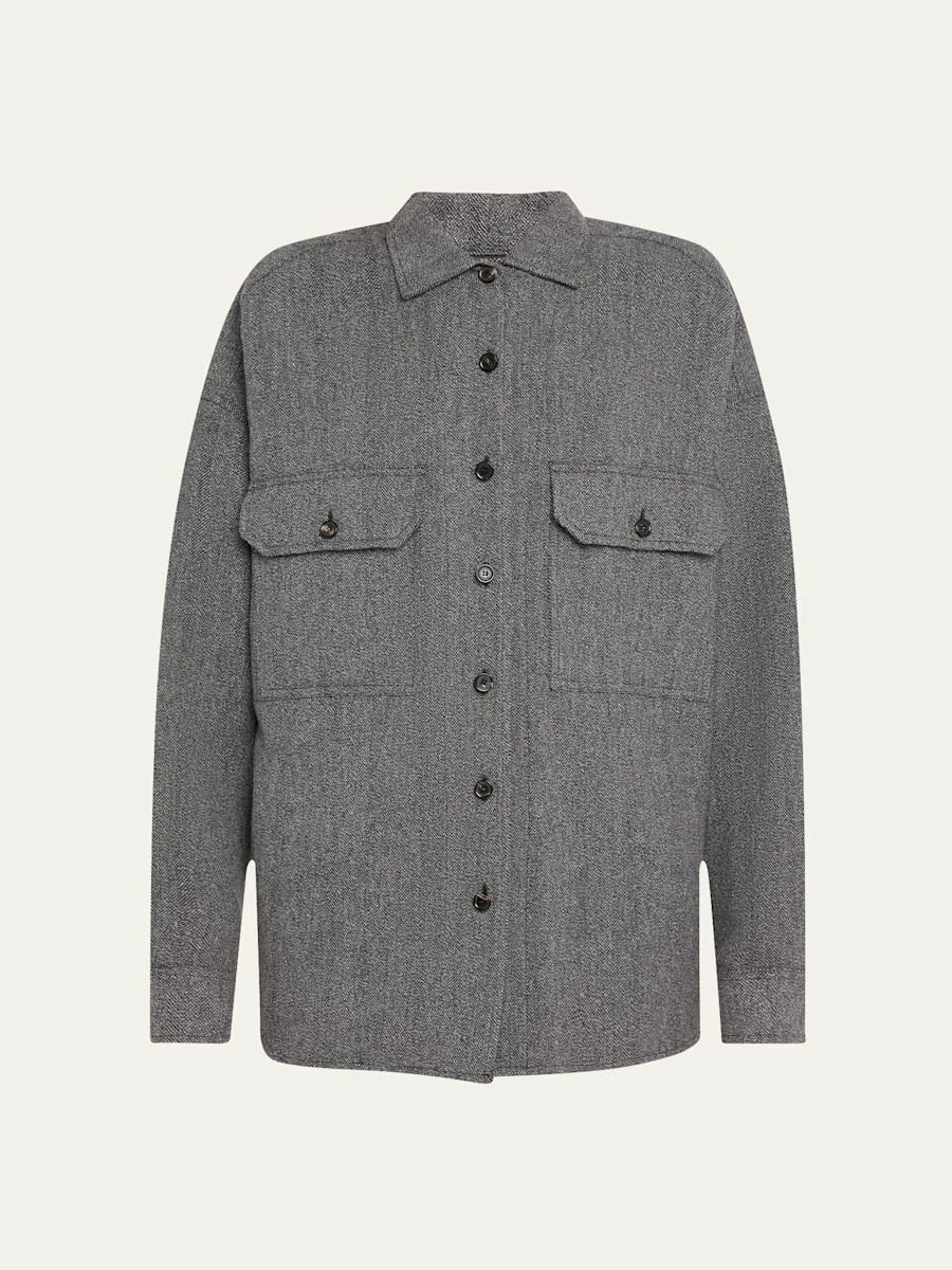 Loro Piana "Darby" linenblend overshirt Spread collar; button front Long sleeves; button cuffs Chest flapbuttoned pockets Straight fit Back yoke Linen/virgin wool/cashmere Made in Italy