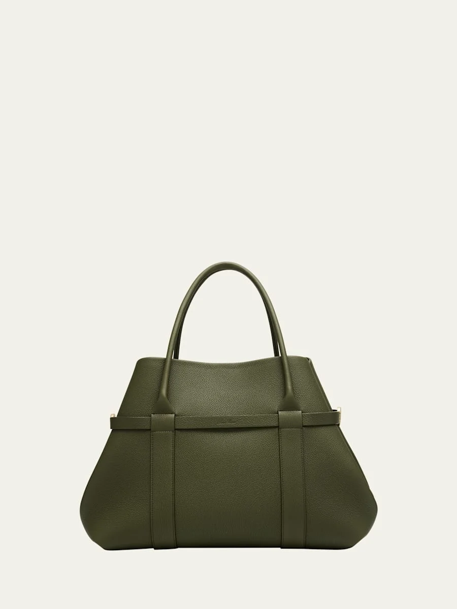 Loro Piana "Ghiera" shopper tote bag in grained leather Top handles Open top with chain toggle closure Attached zip pouch Exterior, side buckle accent Lining: Cashmere Approx. 11.4"H x 17.7"W x 8.2"D Wipe clean Made in Italy