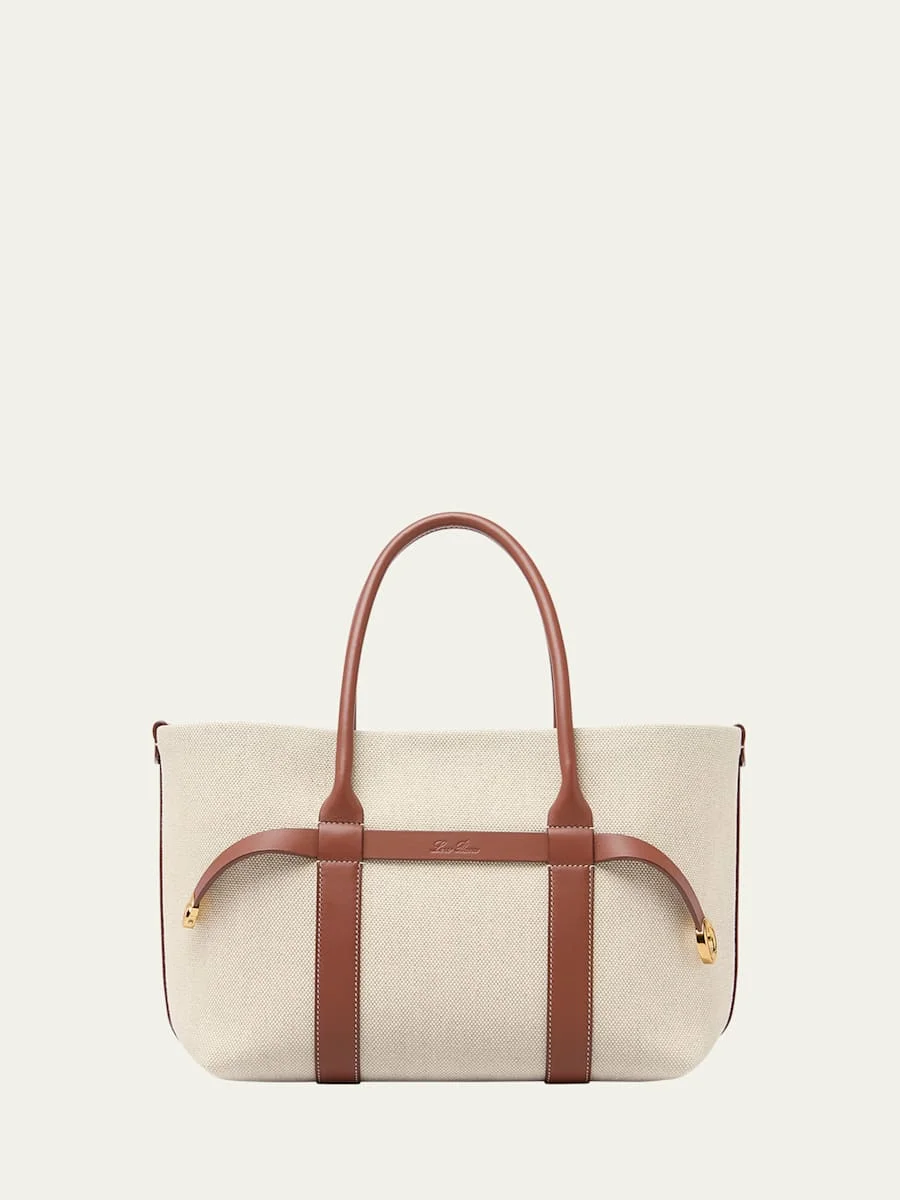 Crafted from cotton and linen, the Loro Piana "Ghiera" shopper bag is finished with topstitched calfskin leather trim. Dual-top leather handles Can be worn as a tote or shoulder bag Open top with ring closure Exterior, decorative clasp, embossed logo on center leather strap, gold-tone hardware Interior, detachable inner pouch Natural canvas (cotton/flax) lining Approx. 7.8"H x 11.8"W x x 5.5"D Made in Italy Proposition 65 warning for California residents Online Inquiries: BGS21_V6B94| Store Inquiries: #4862794