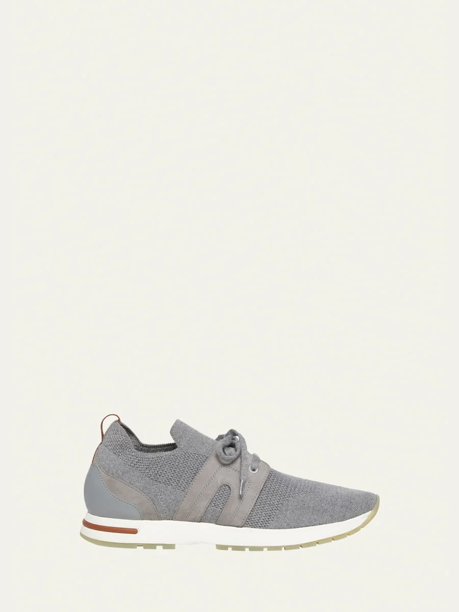 Loro Piana knit fabric sneakers with suede trim. 0.5" flat heel. Round toe. Laceup vamp. Leather lining. Rubber sole. Made in Italy.