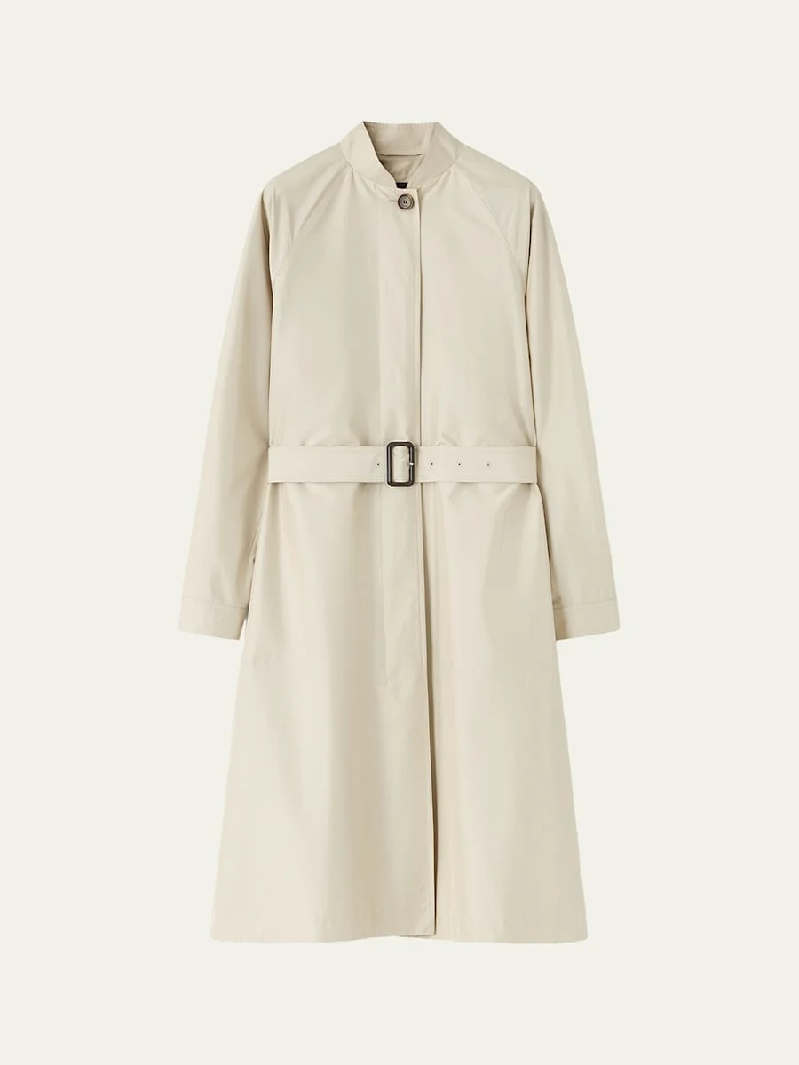 Crafted from smooth Habutai silk and coated with a layer of Storm System® for functionality, the "Leonard" trench coat from Loro Piana features signature horn buttons and a selffabric belt that cinches the waist Mandarin collar; singlebreasted front Long raglan sleeves; button cuffs Belted waist Hip patch pockets Aline silhouette Hem falls below the knee Concealed button front closure Silk Dry clean Made in Italy SIZE amp; FITModel measurements: 5'10" tall Model is wearing a US size 4/Small
