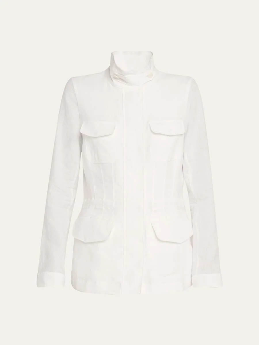 Loro Piana traveler jacket in linen. Stand collar with two-button tab. Concealed front closure. Long sleeves; button cuffs. Four flap pockets. Internal drawstring waist. Relaxed fit. Linen. Made in Italy. Online Inquiries: BGS21_B9SN2| Store Inquiries: #4043714