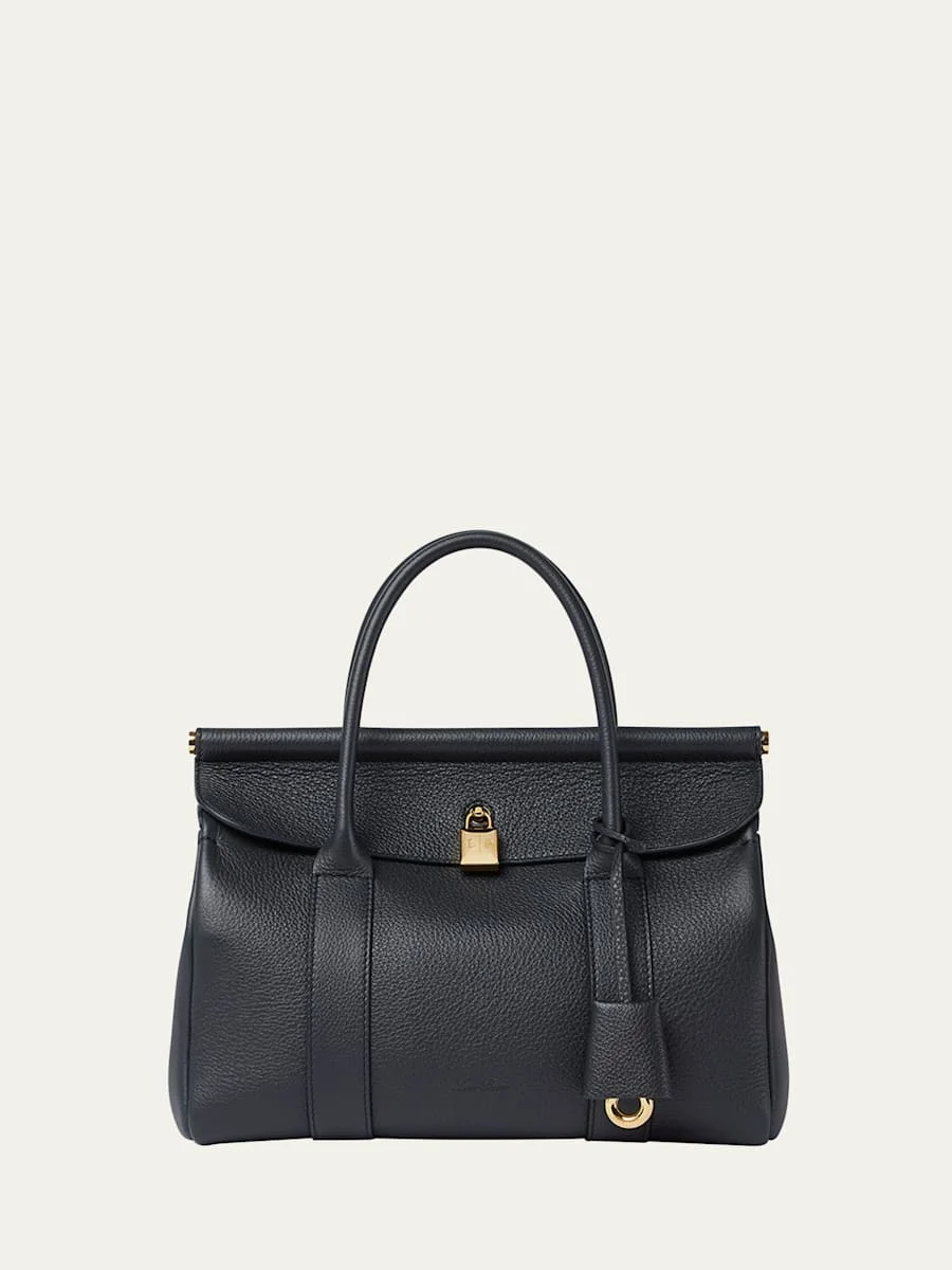 The Loro Piana "Loom" calfskin leather bag features a metal bar beneath the flap, evoking the image of fabric gently draped across a loom-a nod to the brand's centuriesold textile heritage and weaving techniques. Dual top handles Detachable adjustable crossbody strap Can be worn as a tophandle or crossbody bag Padlock closure Exterior, signature interchangeable charms Interior, removable pouches Ringshaped feet protect the bottom of the bag Approx. 7.8"H x 10.6"W x 5.5"D Wipe clean Made in Italy