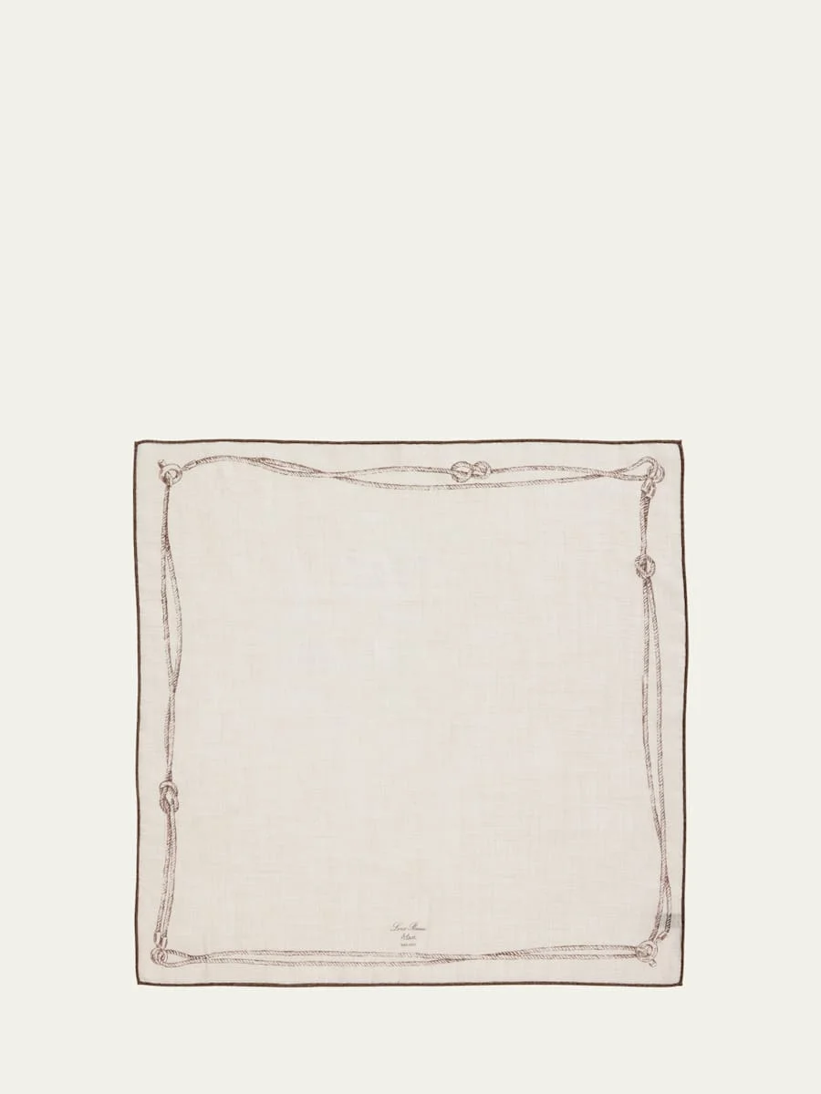 Loro Piana square scarf in a refined blend of cashmere and silk featuring an Alare print – a nautical term that refers to the ropes of a sailing boat Approx. 24"L x 24"W May be styled multiple ways The center is framed with elegant lines featuring a panoply of different knots Contrasting hand-rolled edges Logo set into the print Cashmere/silk Dry clean Made in Italy Online Inquiries: BGS21_NCYXG| Store Inquiries: #4977532