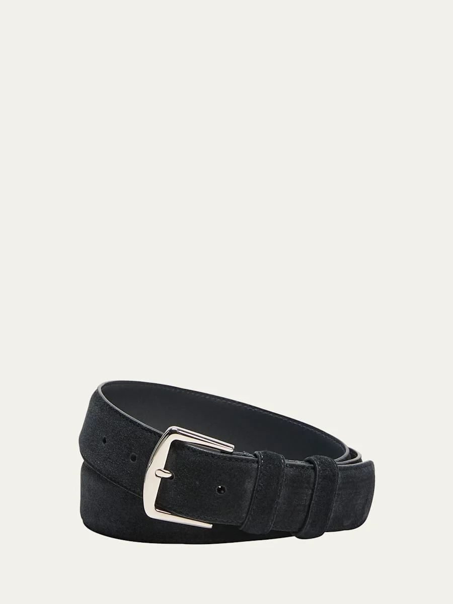 Loro Piana "Alsavel" belt in suede. Palladium-finished brass buckle. Smooth calfskin lining. Approx. 1.3"W. Adjustable fit. Made in Italy. Online Inquiries: BGS21_NDNG4| Store Inquiries: #83406