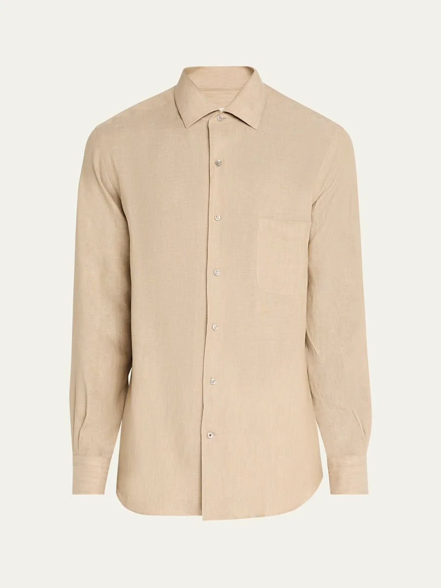 Loro Piana "Andre" lightweight shirt. Spread collar; buttonfront. Long sleeves with button cuffs Chest pocket Regular fit Linen. Made in Italy.