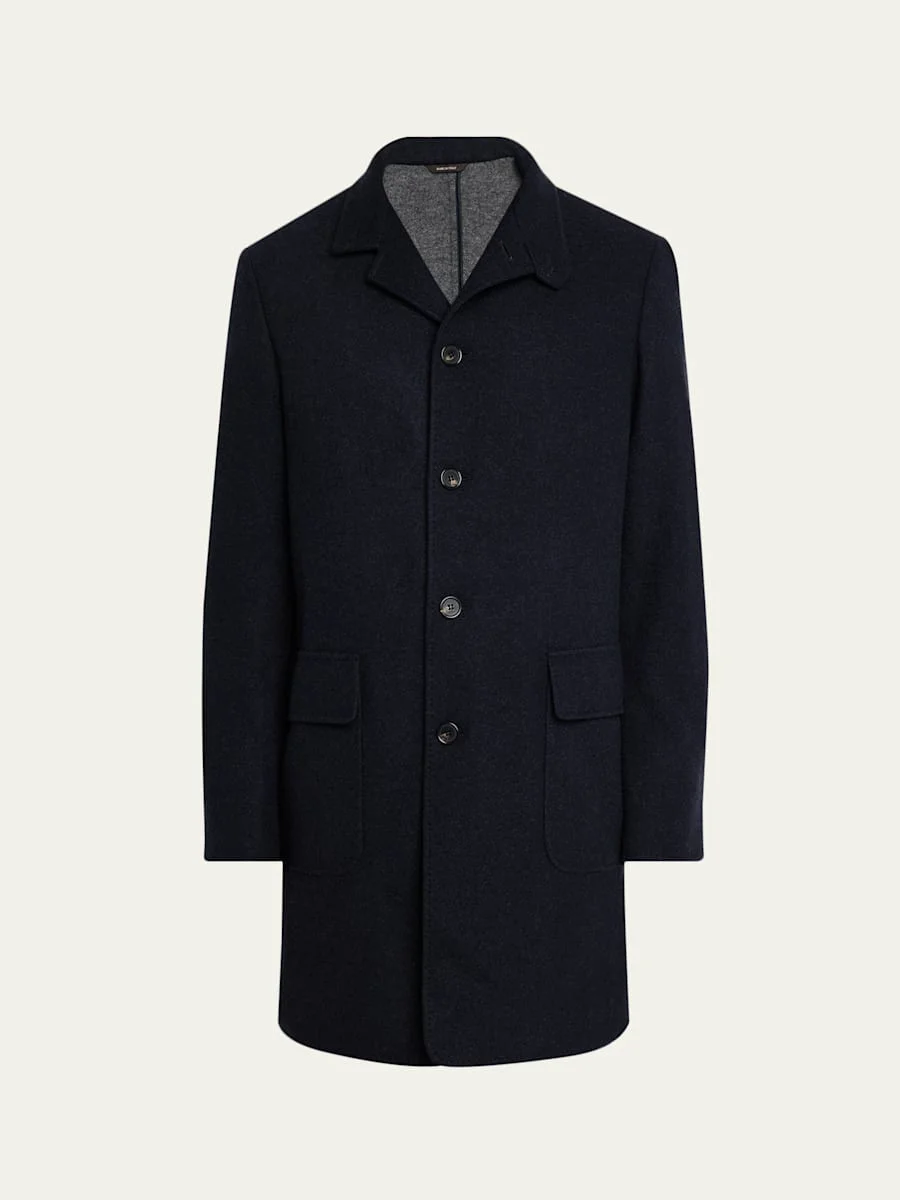 Loro Piana sweater coat in heathered knit. Stand collar; button front. Oversized flap pockets at hips. Straight hem. Cashmere/nylon. Made in Italy. Online Inquiries: BGS21_NEPV2| Store Inquiries: #2631578