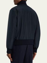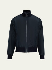 Loro Piana "Denzel" bomber jacket in Silk Tech with an oversized silhouette Silk Tech is a fabric fusing the elegance and soft hand of habutai silk and the weather-proofing qualities of Storm System® Water-repellent and wind-resistant finish Ribbed rolled-up collar Two-way zip fastening Branded zip pulls Side zip pockets Interior side zip pockets Dropped shoulder seams Long sleeves Ribbed cuffs and hem Lined Regular fit Silk Polyester fill Dry clean Made in Italy Online Inquiries: BGS21_NCXSV| Store Inquiries: #4970952