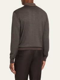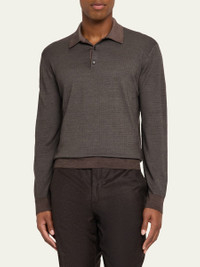 Loro Piana polo shirt crafted from a refined blend of warm Merino wool and lustrous silk, for a naturally breathable feel and thermoregulating properties Genuine mother-of-pearl buttons 18 gg Spread collar Three-button placket Long sleeves Ribbed cuffs and hem Pullover style Virgin wool/silk Unlined Dry clean Made in Italy Online Inquiries: BGS21_NDQA0| Store Inquiries: #5066101