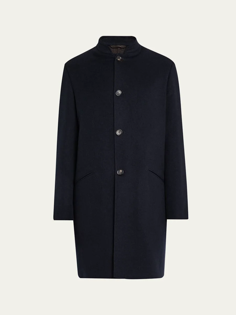 Loro Piana "Javier" overcoat in a sublime double-layer of Cashmere Rain® for a warm and water-repellent finish Stand collar Button front Hip besom pockets Long sleeves Buttoned cuffs Long length Cashmere Lining: Cotton/modal Dry clean Trim: Leather Made in Italy Online Inquiries: BGS21_NDQ9U| Store Inquiries: #5066093