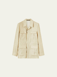 Loro Piana "Mojave" jacket with four front flap pockets Notch collar Concealed button front Long sleeves Singlebutton cuffs Internal waist cinch Flax/nylon/polyamide Made in Italy