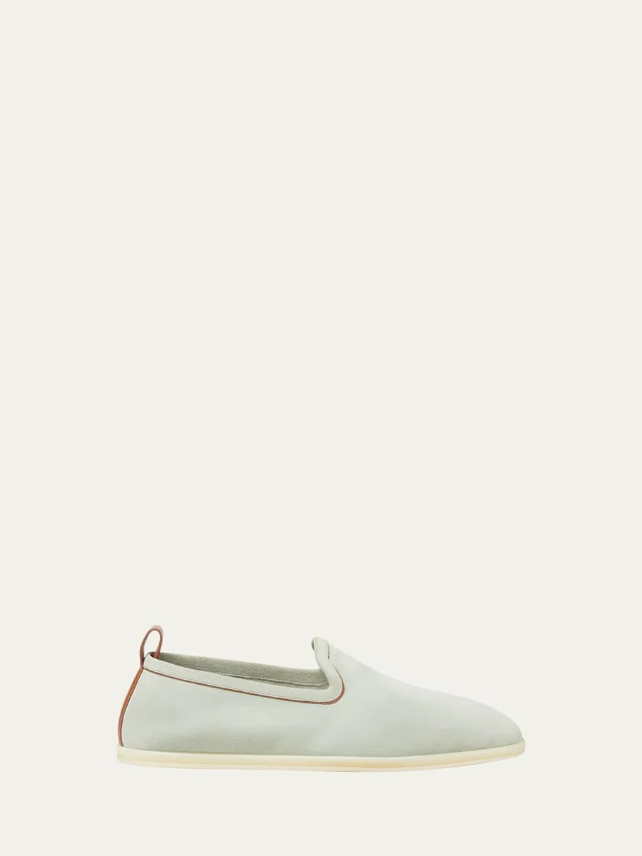 Loro Piana loafers in suede with leather trim Flat heel Round toe Notched vamp Leather pull tab and stamped logo at backstay Rubber outsole Slip-on style Made in Italy Online Inquiries: BGS21_NB198| Store Inquiries: #4559530