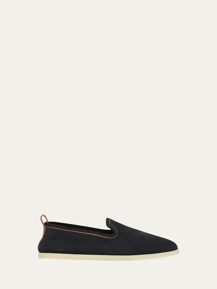 Loro Piana loafers in suede with leather trim Flat heel Round toe Notched vamp Leather pull tab and stamped logo at backstay Rubber outsole Slip-on style Made in Italy Online Inquiries: BGS21_NB198| Store Inquiries: #4559530