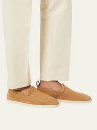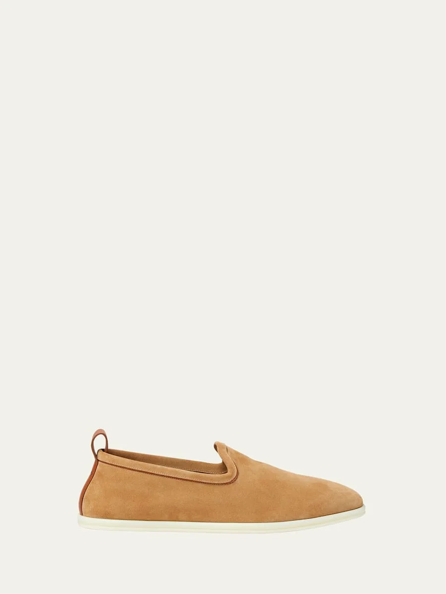 Loro Piana loafers in suede with leather trim Flat heel Round toe Notched vamp Leather pull tab and stamped logo at backstay Rubber outsole Slip-on style Made in Italy Online Inquiries: BGS21_NB198| Store Inquiries: #4559530