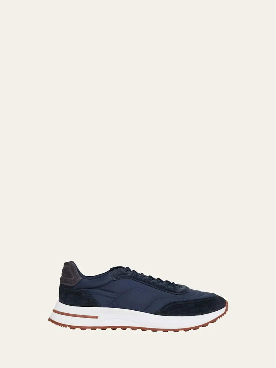 Loro Piana "Weekend Walk" lowtop sneakers with textile upper and suede leather overlays Flat heel Reinforced round toe Laceup vamp Contrast suede panel at backstay Rubber outsole Made in Italy