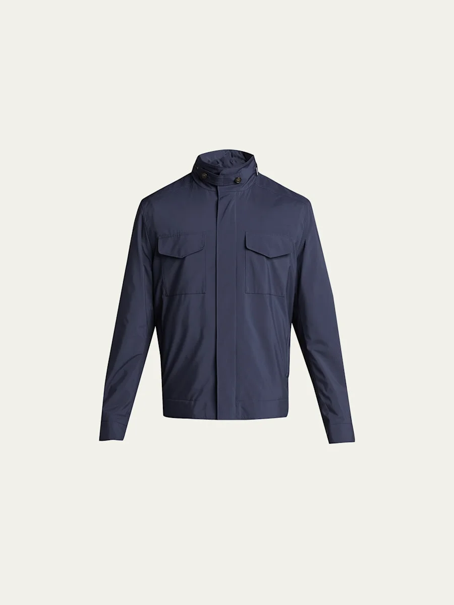 Loro Piana "Traveler" bomber jacket in lightweight, creaseresistant Windmate® microfiber and knitted cashmere. Treated with Storm System® for waterproof, windresistant protection. Approx. 26.7"L from shoulder to hem (size M/50). Stand collar with throat latch; snap/zip front. Technical fabric zipout hood. Flap pockets on chest. Polyester. Trim/lining: cashmere Dry clean. Made in Italy.