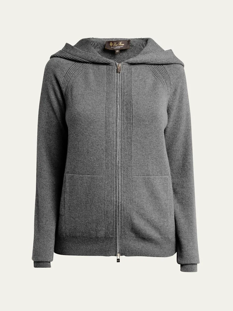 Loro Piana bomber-style sweater in engineered knit. Hooded neckline; two-way front zip. Long raglan sleeves. Side slip pockets. Baby cashmere. Made in Italy. Model is 5'10"/177cm. Online Inquiries: BGS21_B59LN| Store Inquiries: #2196052