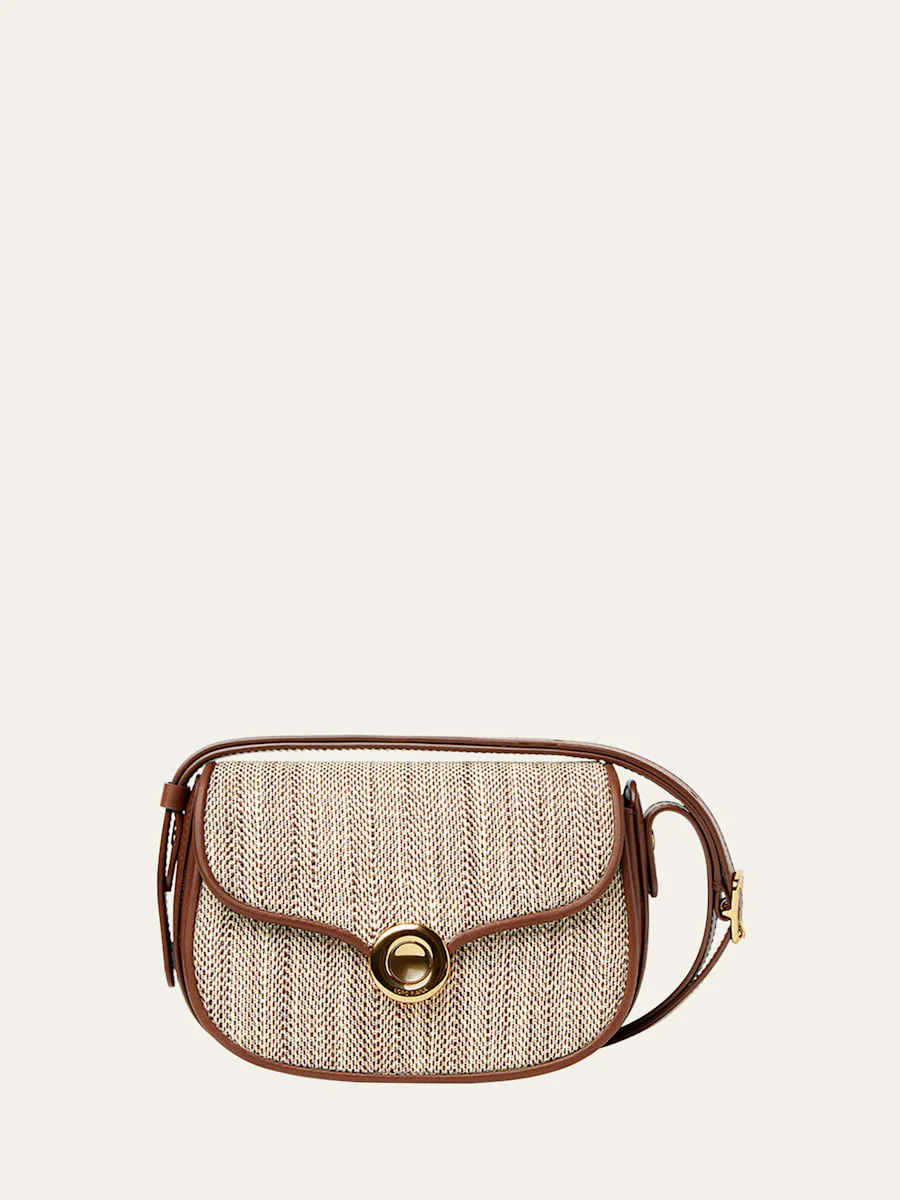 Loro Piana "Mini Ghiera" bag in a silk and linen chevron fabrication is a more angular version of the original Flap closure features the new signature press stud in the shape of the Loro Piana ring, with a laserengraved logo Expanding gussets create a spacious internal compartment Internal, 3 internal pockets: card holder, zipped pocket, and gusset pocket with Ghiera button fastening Approx. 6.2"H x 9"W x 3.1"D Made in Italy