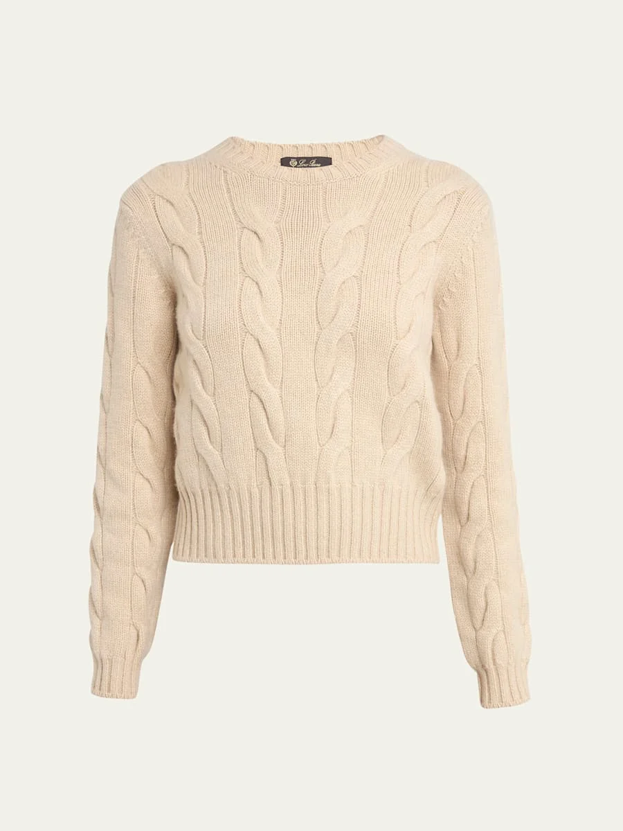 Loro Piana "Napier" cableknit crewneck sweater in cashmere Crew neckline Long sleeves Ribbed trim Hip length Pullover style Relaxed fit Cashmere Dry clean Made in Italy