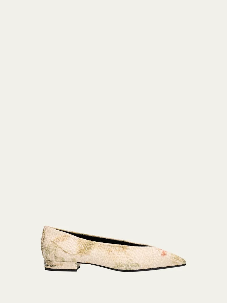 Loro Piana "Rebecca" abstract floral-print linen ballerina flats 0.25 in / 10 mm flat heel Pointed toe Slip-on style Leather outsole Lining: Leather Wipe clean Made in Italy Proposition 65 warning for California residents Online Inquiries: BGS21_X6T13| Store Inquiries: #4950746