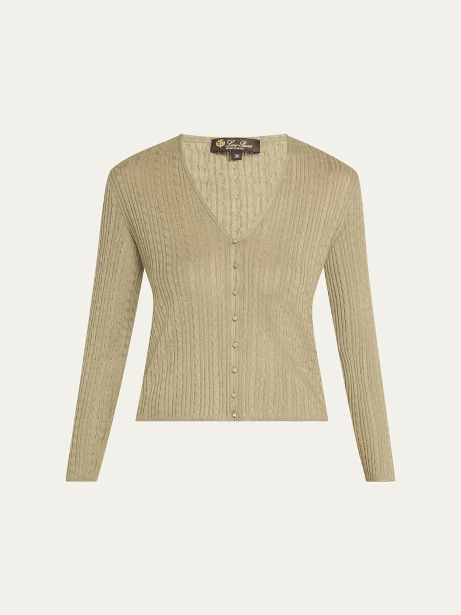 Loro Piana "Rimella" cable-knit cardigan in a cashmere-silk blend V neckline Long sleeves Classic fit Hem sits at the hip Button-front Cashmere/silk Made in Italy Online Inquiries: BGS21_BB4HP| Store Inquiries: #4863281