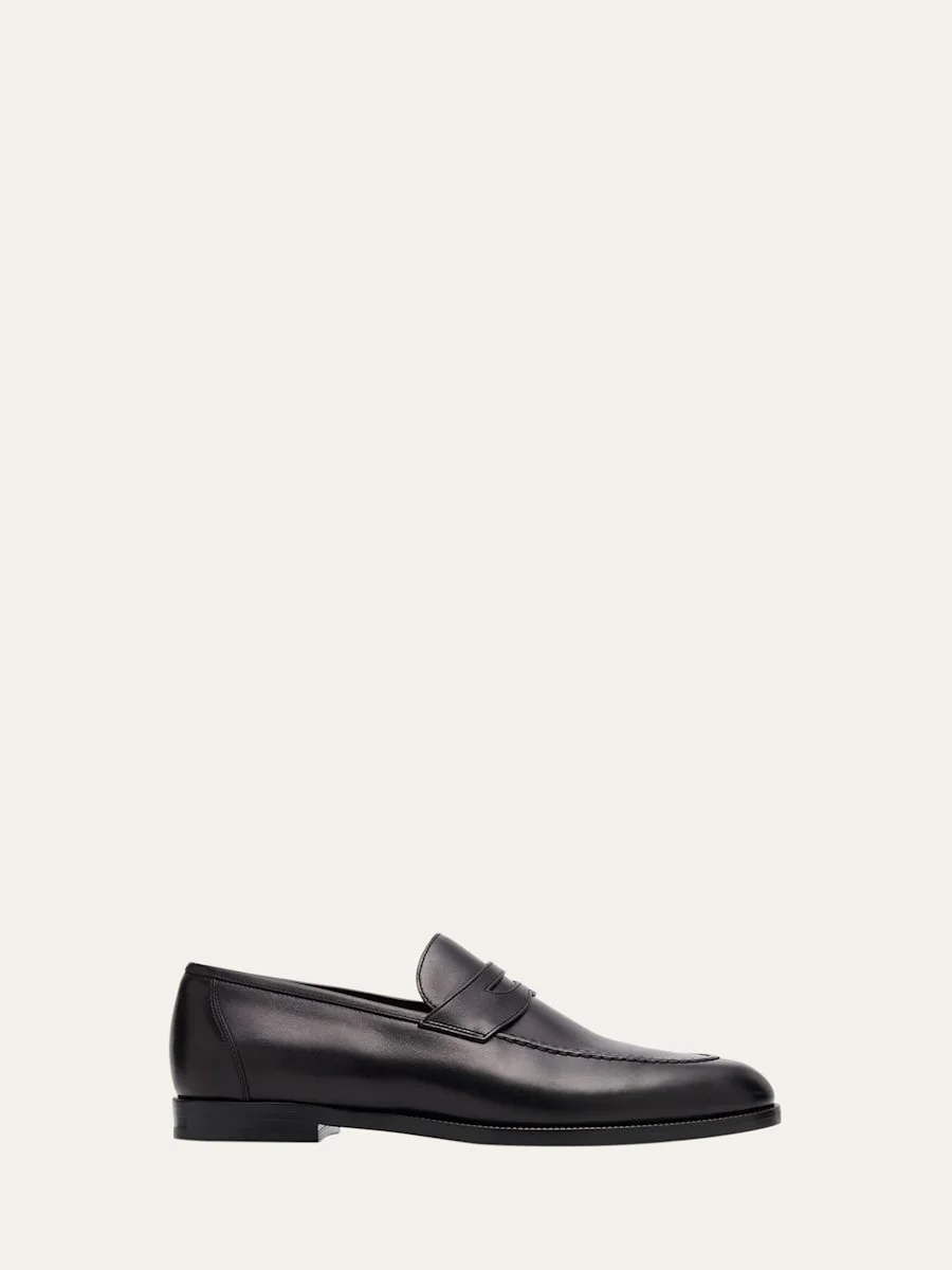 Loro Piana "Sergio" calf leather penny loafers 0.25 in / 10 mm flat heel Round moc toe Notched vamp with keeper strap Slip-on style Leather outsole Lining: Leather Wipe clean Made in Italy Proposition 65 warning for California residents Online Inquiries: BGS21_X6T11| Store Inquiries: #4950744