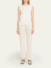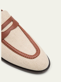 Exuding Italian craftsmanship, the "Sergio" loafers by Loro Piana are crafted from a natural blend of cotton and linen with smooth calf leather trim Stacked flat heel Almond moc toe Notched vamp with keeper strap Slipon style Leather lining and outsole Made in Italy