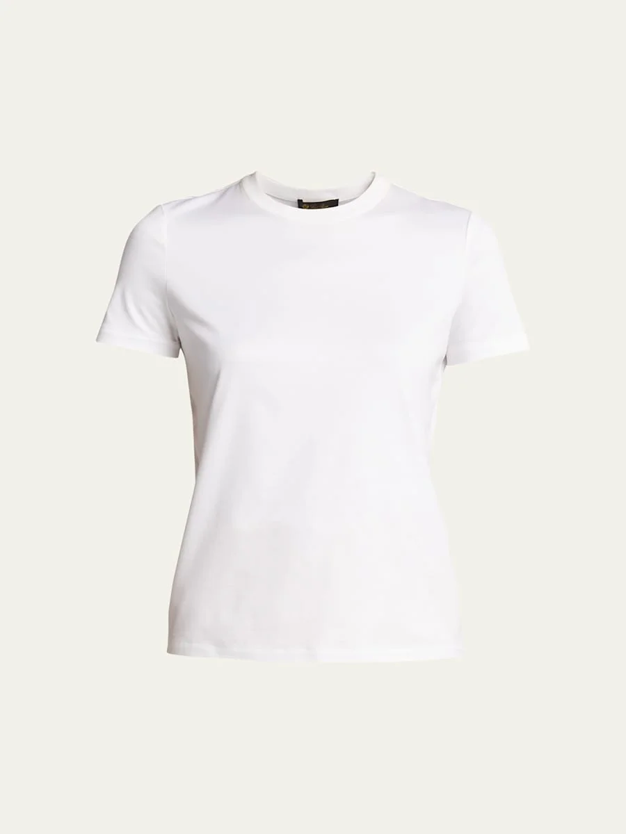 Loro Piana top in jersey with logo embroidery. Crew neckline. Short sleeves. Fitted. Straight hem. Pullover style. Cotton. Made in Italy. Model is 5'10"/177cm. Online Inquiries: BGS21_B4LXV| Store Inquiries: #2789981