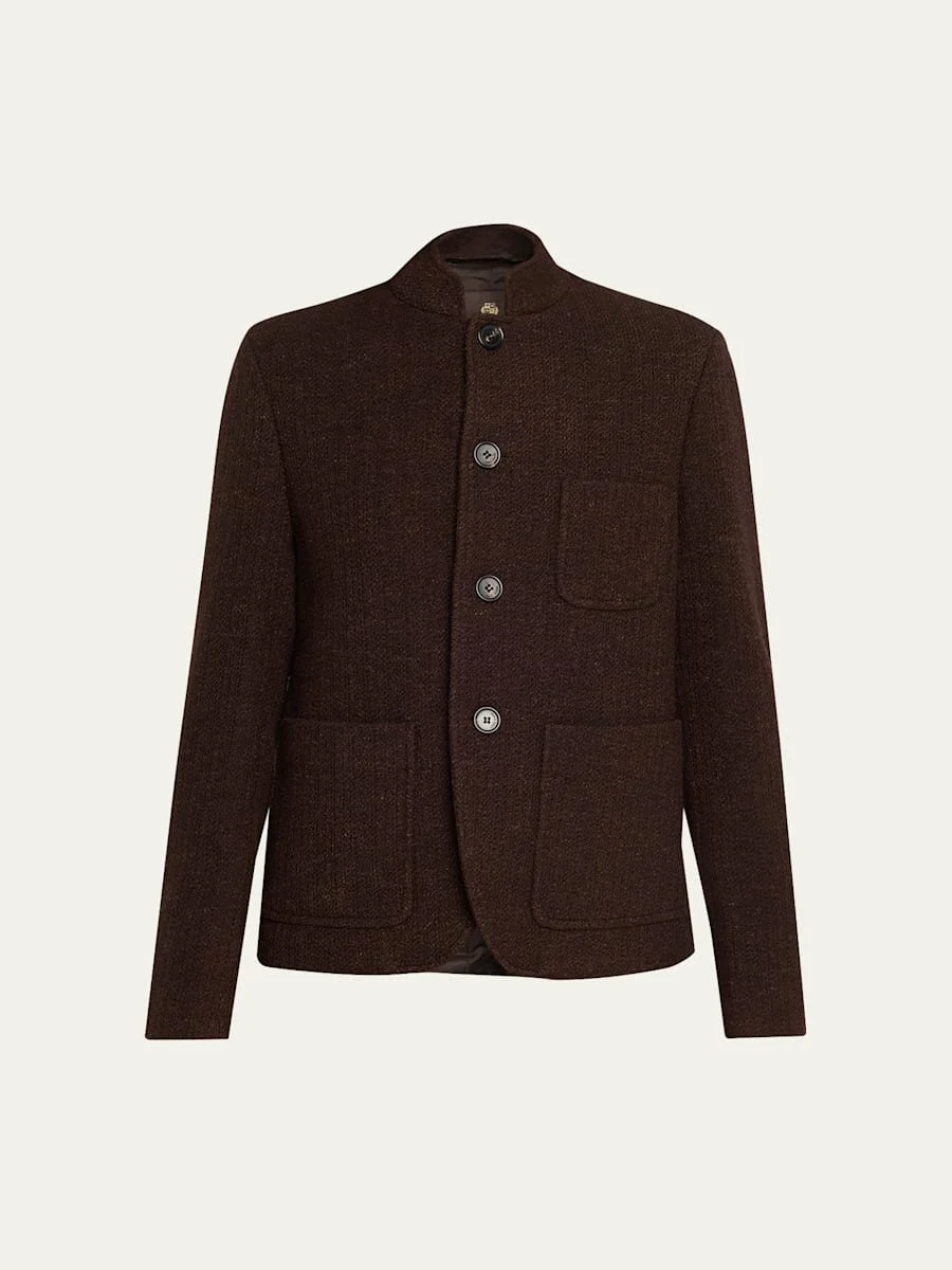 Inspired by a Spanish officer's uniform, Loro Piana's iconic "Spagna" jacket is made from jersey fabric composed of wool, silk, and linen Stand collar; button front Long sleeves; buttonless cuffs Front patch pockets Fitted silhouette Hip length Virgin wool/silk/linen Made in Italy