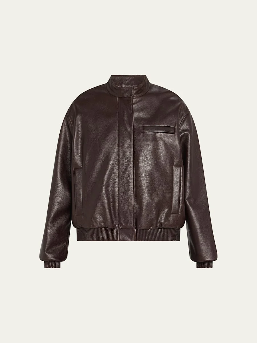 Loulou Studio "Marlow" bomber jacket in pebbled calf leather Band collar; concealed zip front Long sleeves Chest and hip welt pockets Relaxed fit Hip length Ribbed cuffs and hem Leather Dry clean Imported Online Inquiries: BGS21_BA7Y0| Store Inquiries: #5049062