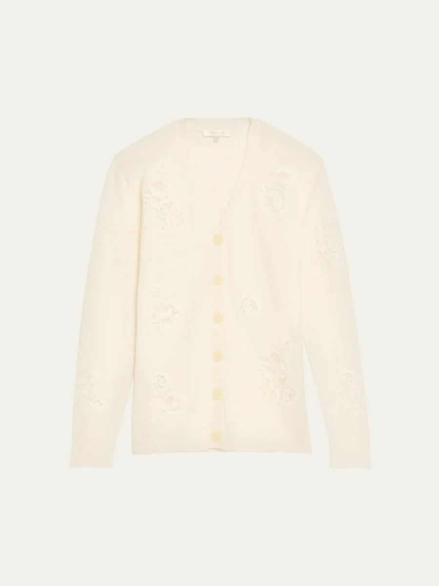 The "Brynnella" boyfriendstyle cardigan by LoveShackFancy is crafted in warm and extrasoft cashmere wool blend with delicate floral lace patches Approx. 18.8"L from shoulder to hem V neckline Long sleeves Relaxed fit Hip length Button front closure Cashmere/wool Dry clean Imported
