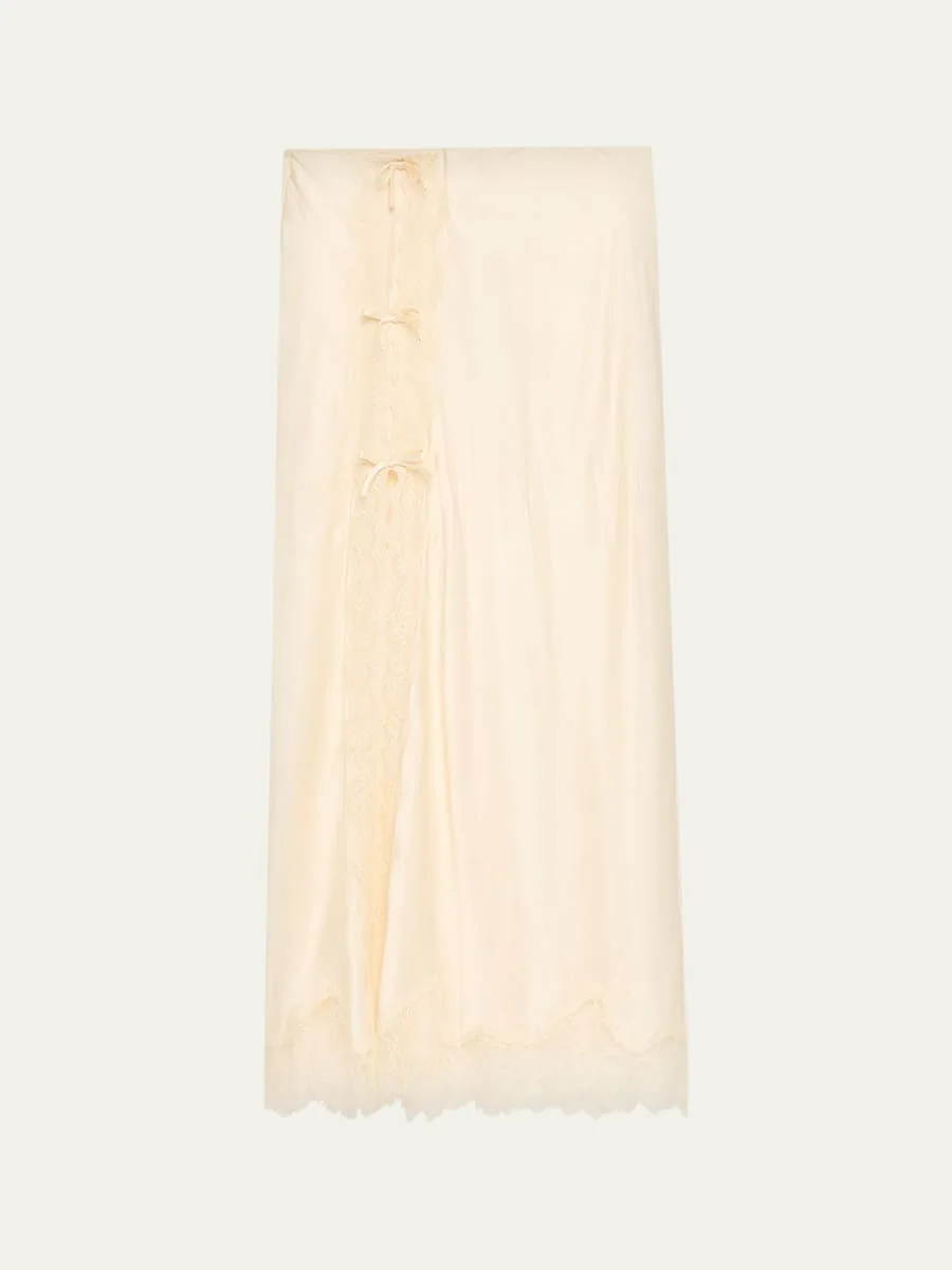 LoveShackFancy "Calder" biascut silk charmeuse slip skirt with delicate chantilly lace trims Highrise waistband Thighhigh side slit Hem falls below the knee Slipon style Silk/viscose/nylon/polyamide Unlined Dry clean Imported