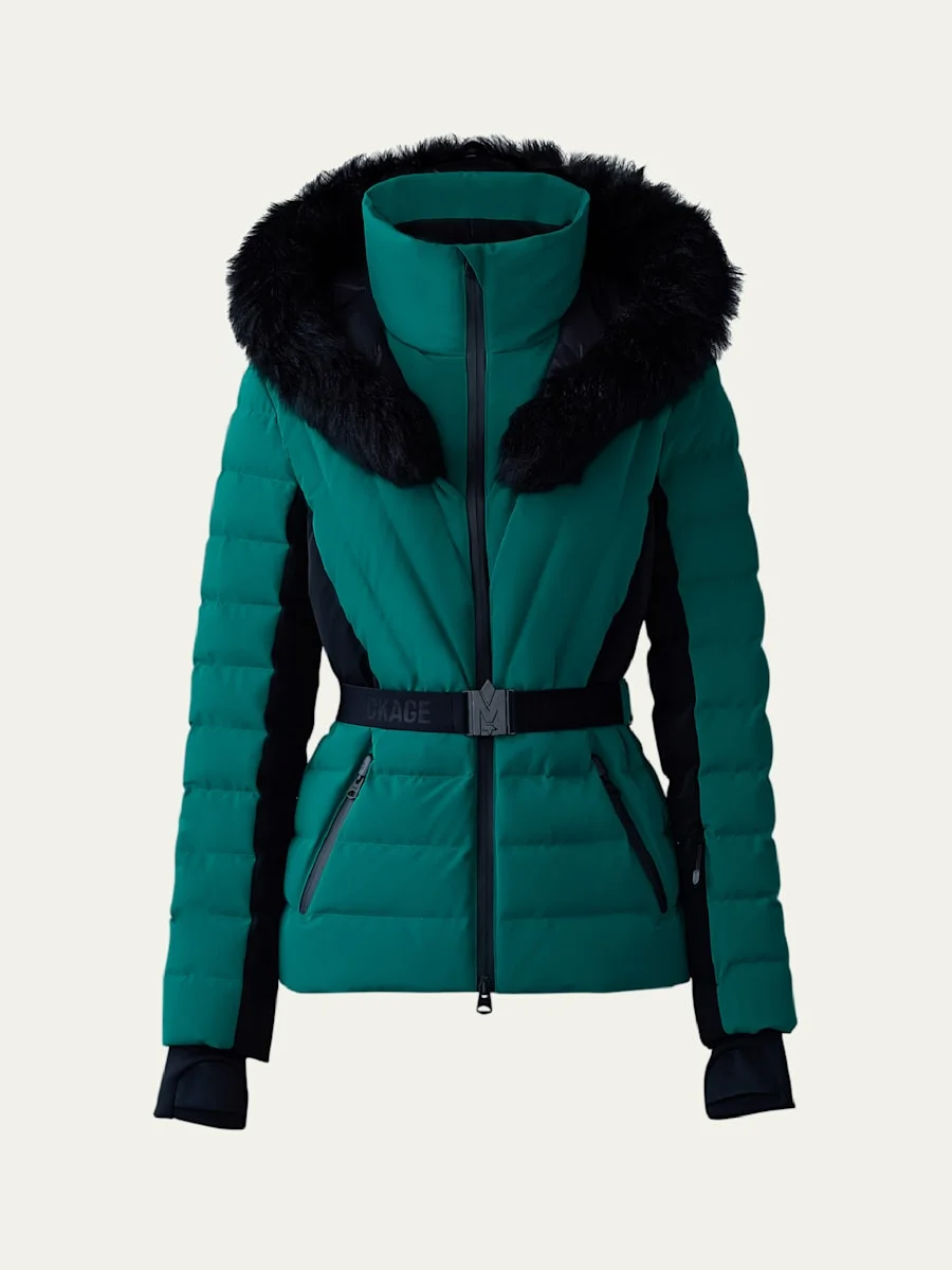 Mackage "Elita" ski jacket featuring a removable hood with detachable dyed shearling (Spain) trim Water-resistant and windproof Stand collar; storm placket Long sleeves with thumbhole cuffs; invisible zip pocket Underarm vents Inner pockets and inner cord loop Elastic logo belt with buckle Angled zip pockets Fitted silhouette Removable powder skirt and adjustable hem Zip-front Nylon/polyamide/elastane/shearling Lining: Recycled nylon Fill: Down/feather Machine wash Imported Model is 5'10"/177cm. Online Inquiries: BGS21_T63CJ| Store Inquiries: #4893363