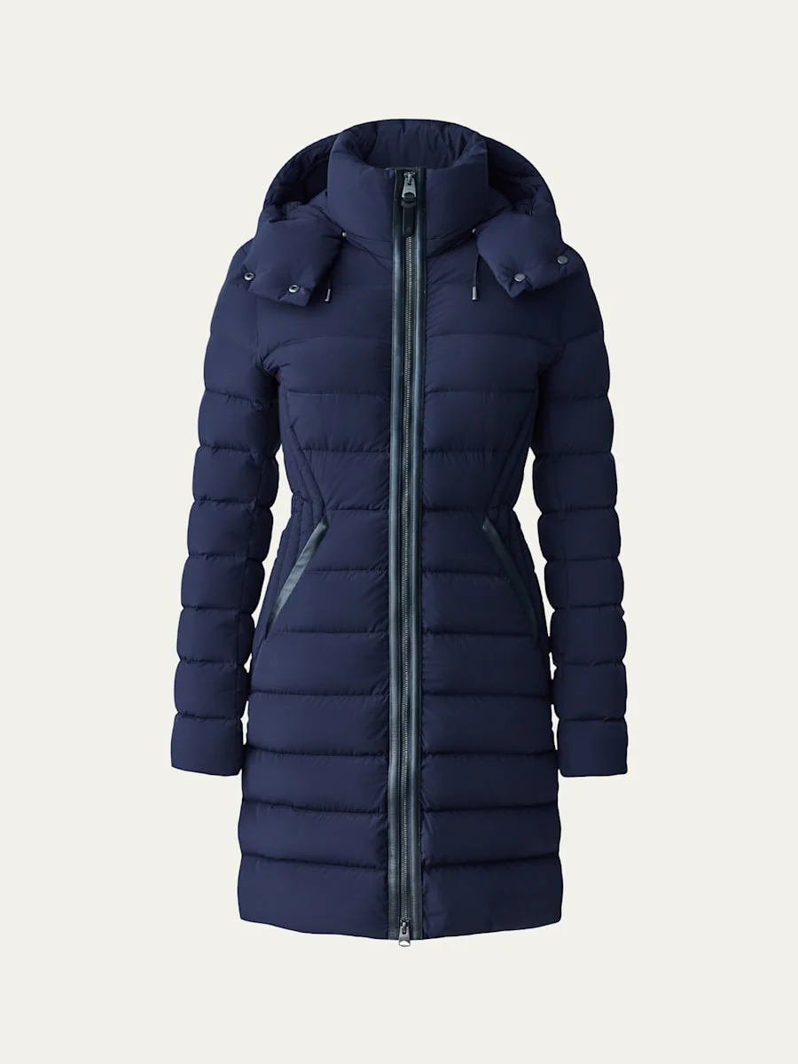 Mackage "Farren" stretch lightweight, quilted coat. Approx. 34.5"L from shoulder to hem. Stand collar; detachable hood. Long sleeves. Two-way zipper. Fitted silhouette. Lower slip pockets. Hem falls above knee. 90/10 goose down/feather fill. Nylon/spandex shell and lining. Calfskin leather trim. Dry clean. Imported. Online Inquiries: BGS21_T19CR| Store Inquiries: #3592432