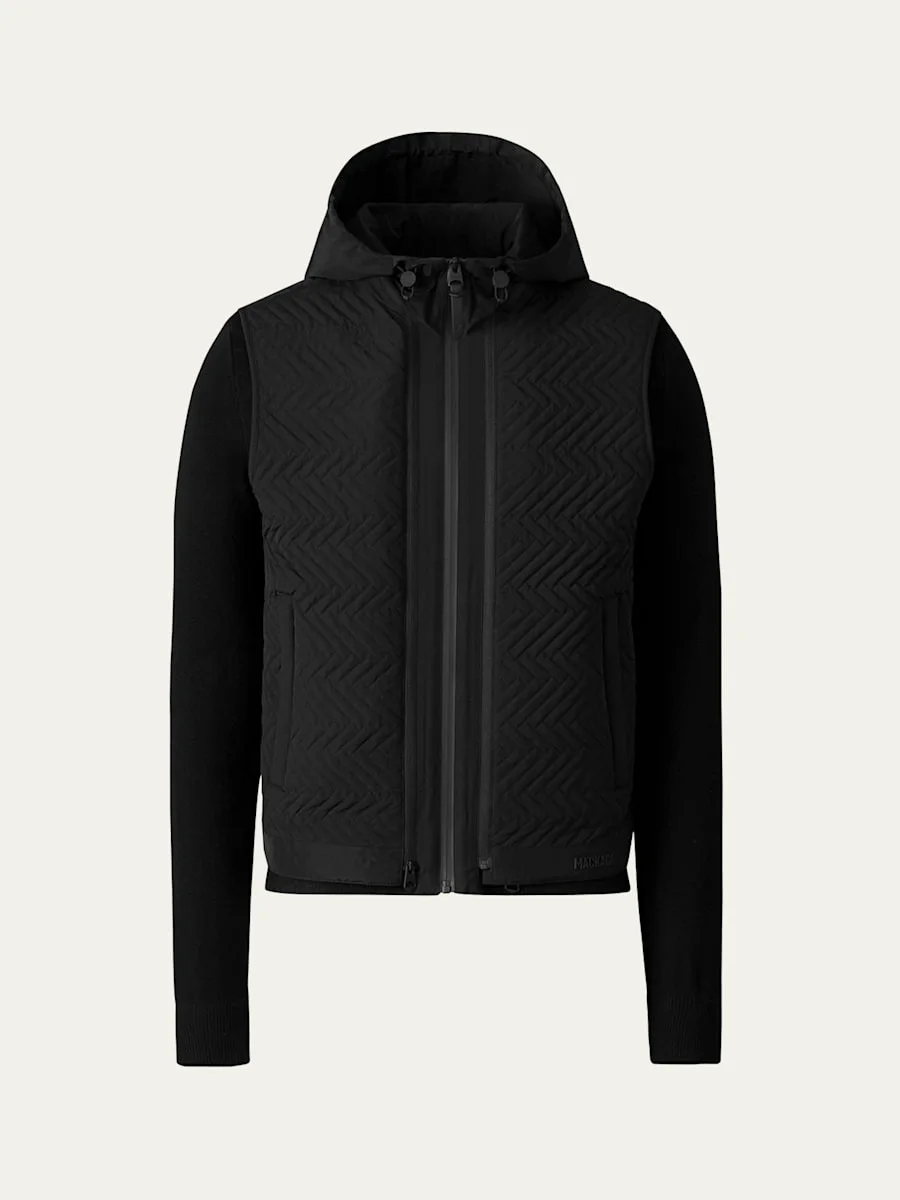Mackage "Barrett" hybrid jacket designed with a 3-in-1 functionality for superior weather adaptability Sweater with contrasting nylon hood Insulated chevron quilted vest Center front zipper closure Welt pockets "Mackage" silicone logo on vest hem Down/feather fill Wool/acrylic/polyester Lining: Nylon Dry clean Imported Online Inquiries: BGS21_ND2WT| Store Inquiries: #5009629